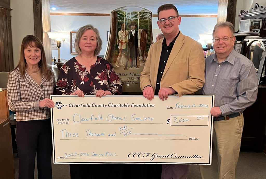 Photo Caption: During 2025, the Clearfield County Charitable Foundation awarded over $600,000 in project grants, endowment distributions and scholarship awards, including a $3000 grant to the Clearfield Choral Society to help fund their 2025-2026 programs – Pictured l-r Susan Williams, Catherine Mandell and Jacob Mandell from the Choral Society and Mark McCracken, Executive Director of the CCCF. In accepting the grant, Jacob Mandell said “The Clearfield Choral Society thanks the Clearfield County Charitable Foundation for its generous grant award. This will help fund our participation in the America250 celebrations held throughout Clearfield County during 2026 and will help in our continued mission to bring quality choral experiences to our area.”