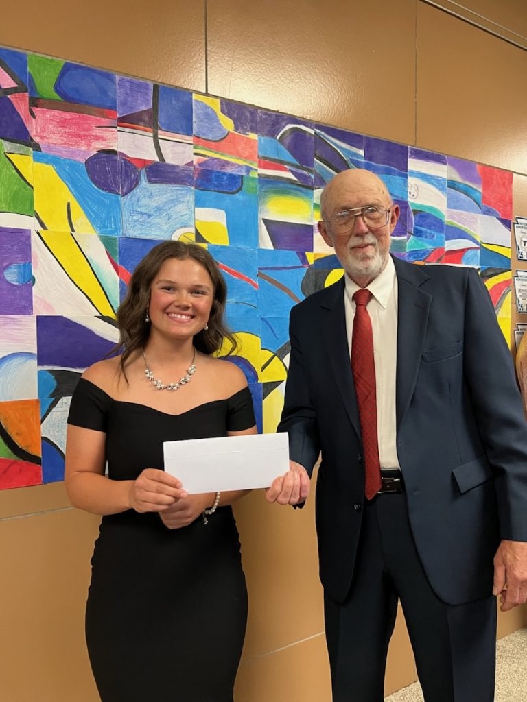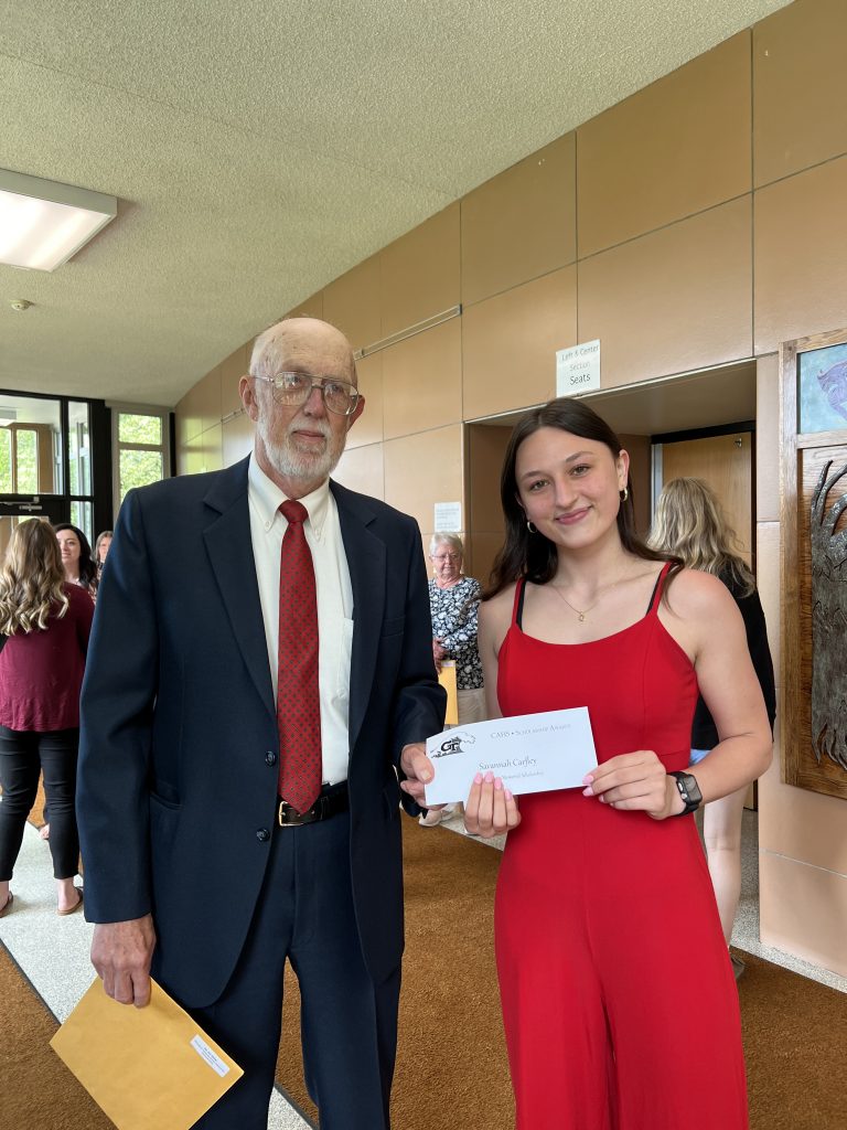 Jim Miller presents the 2024 Shirley Rowles-Miller Memorial Scholarship to Savannah Carfley.