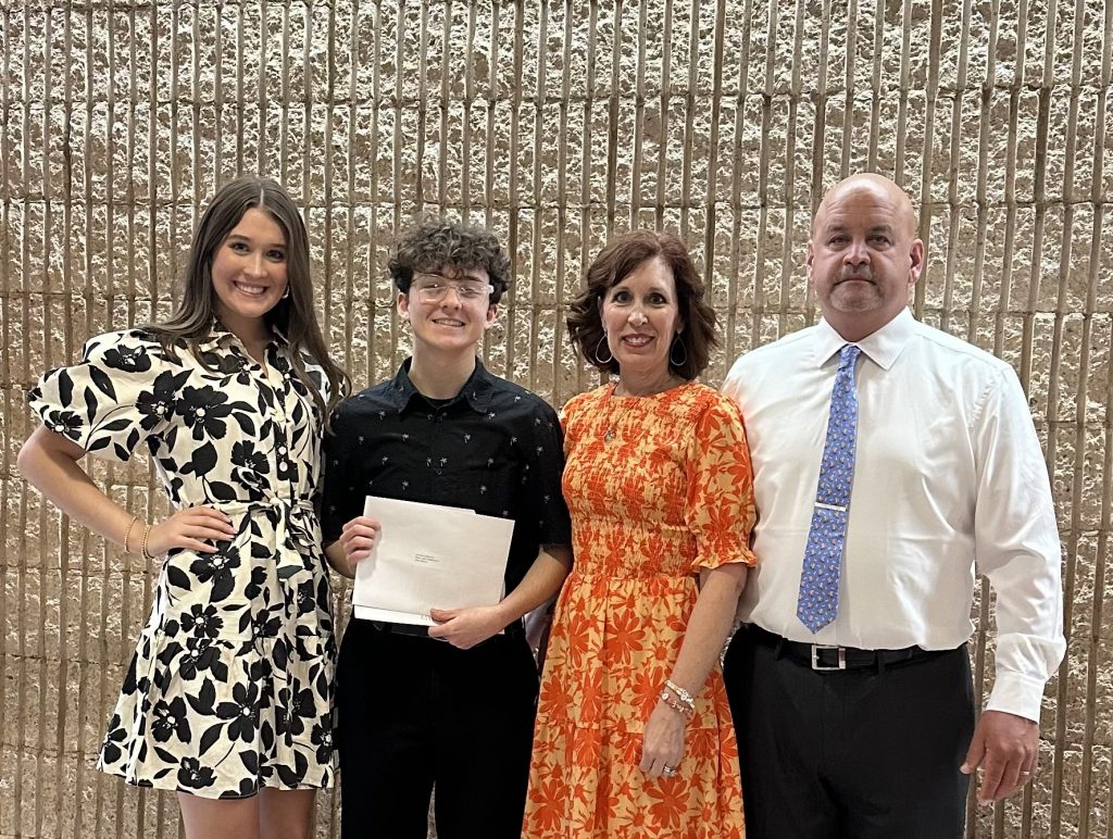 2024 Recipient of the Ava Evans Memorial Scholarship – L-R Madi Evans, Evan Sorbera – Recipient, Beth Evans and Robert Evans.