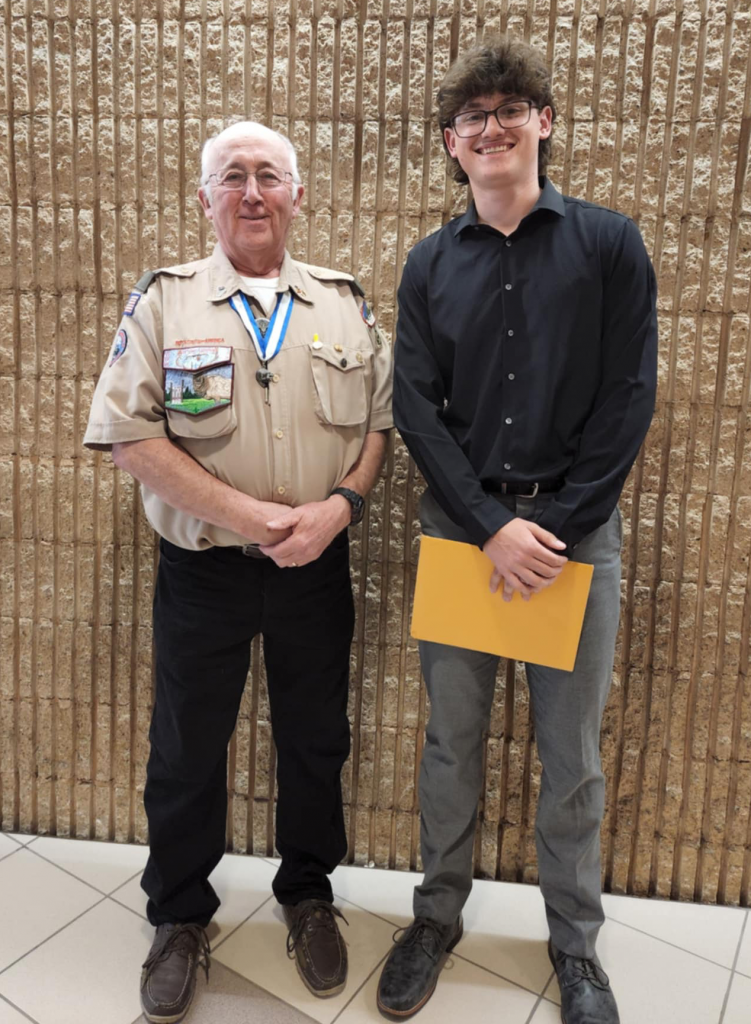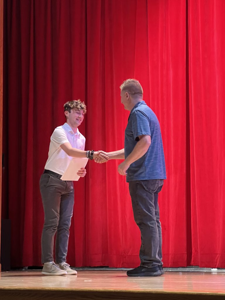 Evan Forcey accepting the 2024 Bob E Day Memorial Scholarship from Matt Day.