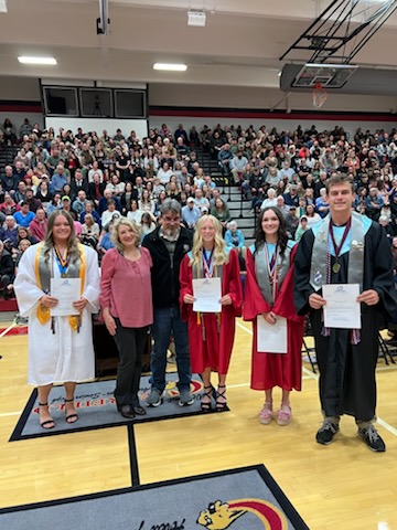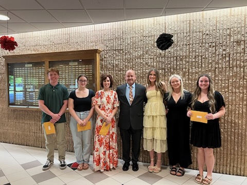2025 T-Harp Scholarship presentation – L-R Bobbi Harpster, John Harpster, recipients Megan Johnson and Ian Haney, Johnny Harpster and Macy Neideigh. Each recipient was awarded a $2,000 scholarship.