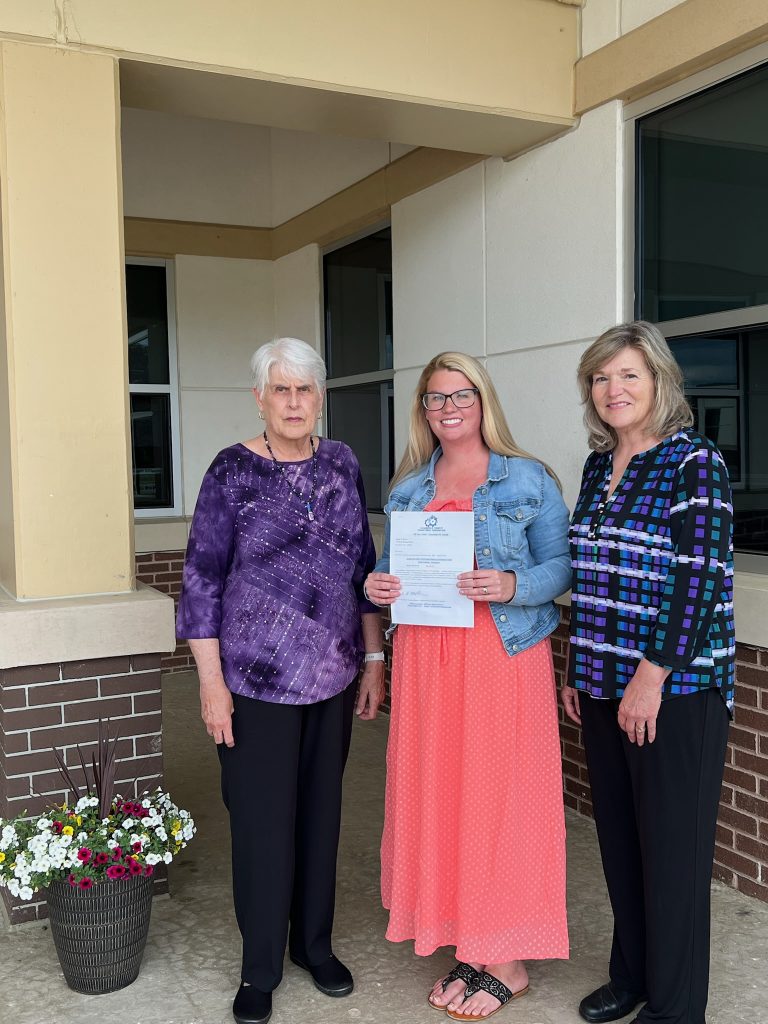 Lauren Davidson graduate of DCC accepting 2024 McFarland-Bishop Scholarship from Barbara Bishop and Phyllis Byerly.