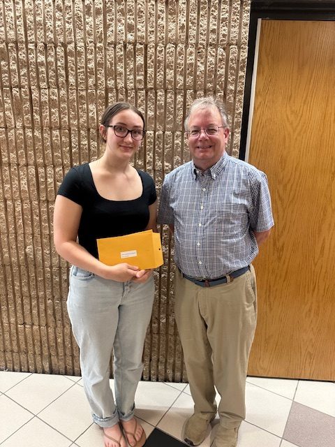 Natalie Wischuck accepts the 2025 Shirley Rowles Miller Memorial Scholarship from Jim Miller.